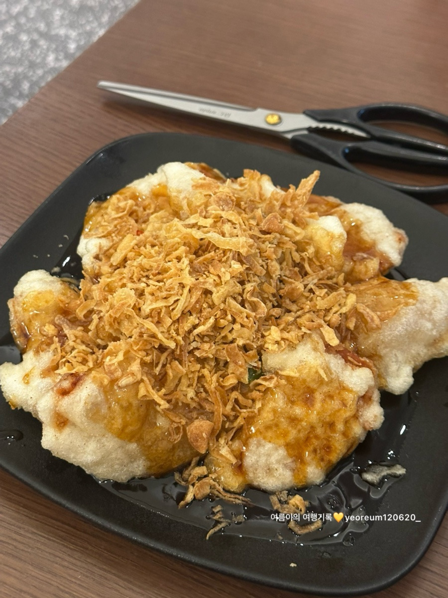 소스와 꿔바로우 고기와 튀긴 양파와 같이 올려 먹으면 진짜 맛있었다! 갓튀겨서 고기도 바삭했고!